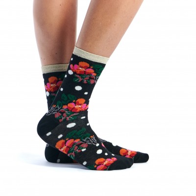 Mi-chaussette femme, coton majoritaire, motif orchidées.