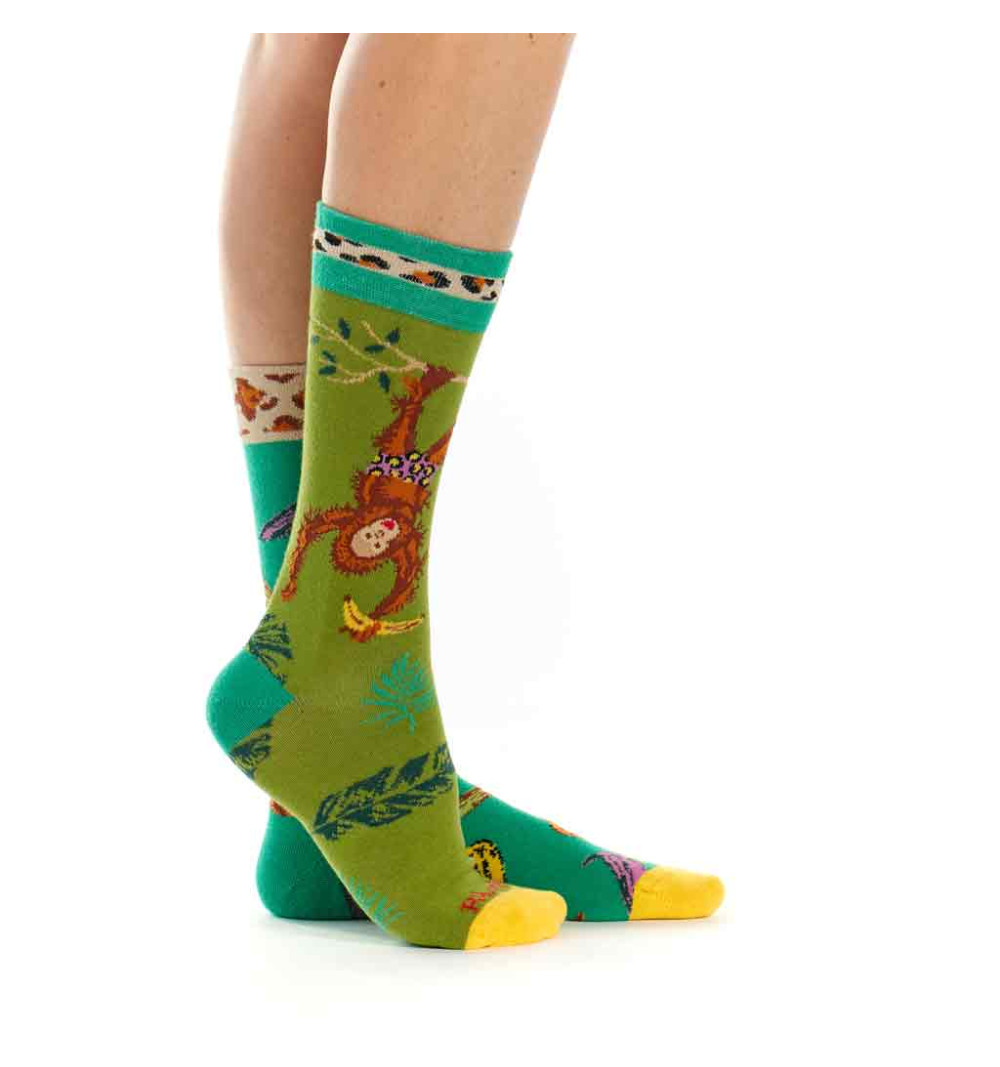 Les mi-chaussettes dépareillées Monkey sont composée d'une chaussette verte avec un singe suspendu à une liane, l’autre verte avec des bananes multicolores.